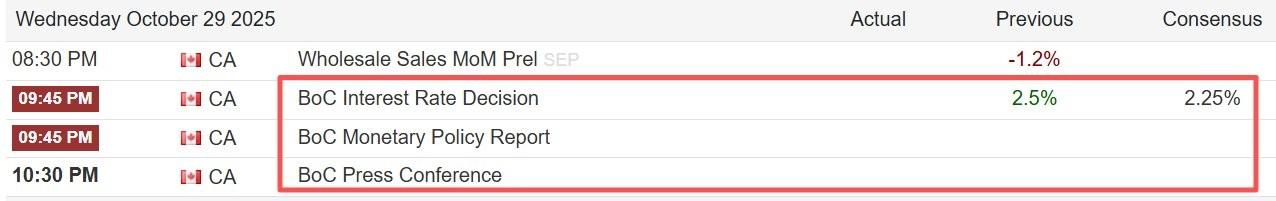 Ngân hàng Canada sẽ công bố quyết định lãi suất tháng 10 vào lúc 9:45 tối thứ Tư tuần này, với kỳ vọng chung là lãi suất sẽ giảm 25 điểm cơ bản. Sự phát triển kinh tế của Canada phụ thuộc rất nhiều vào Hoa Kỳ. Kể từ đầu năm nay, Tổng thống Hoa Kỳ Trump đã liên tục tăng thuế đối với hàng nhập khẩu từ Canada. Cùng với những dấu hiệu suy thoái của nền kinh tế Hoa Kỳ, triển vọng tăng trưởng kinh tế của Canada đang cực kỳ bi quan. Thứ Bảy tuần trước, Trump đã tuyên bố trên mạng xã hội rằng ông sẽ áp đặt thêm 10% thuế quan đối với Canada để trả đũa việc đăng một quảng cáo chỉ trích chính sách thuế quan của Hoa Kỳ. Điều này sẽ làm suy yếu nghiêm trọng niềm tin của thị trường vào việc nắm giữ đồng đô la Canada.